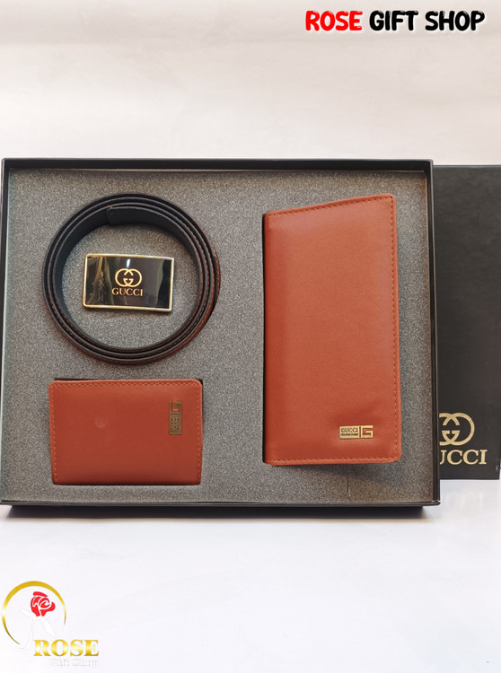 ست چرمی کیف پول وجاکارتی وکمربند برند گوچی 3تکه هارد باکس🩷♥️